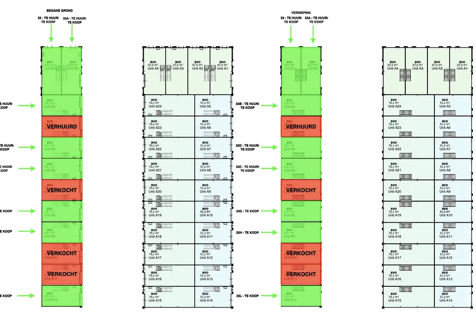 De units zijn separaat te huur of te koop. Er is echter ook de mogelijkheid om meerdere units te koppelen.